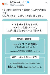 (マスク必須店)ルミネtheよしもと 2023-03-14 最終更新日時 : 2023-07-24 taka_minami ルミネtheよしもと劇場 東京都新宿区新宿3丁目38−2 ルミネ2 7F確認日 2023/03/13「劇場内、観劇中 引き続きマスク着用のご協力をお願いいたします」「ご協力頂けないお客様には入場をお断りさせて頂く場合がございますのでご了承ください」(画像は公式ツイッターより) FacebookXBlueskyHatenaCopy