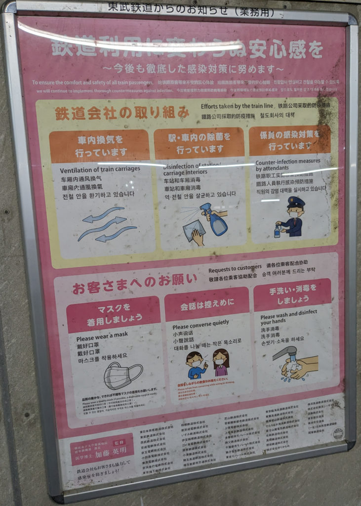 (全国・広域マスクお願い店)東武鉄道 2023-03-18 最終更新日時 : 2024-02-09 taka_minami (全国・広域)東武鉄道公共交通機関確認日 2023/03/18(再確認) 2023/12/25「東武鉄道からのお知らせ お客様へのお願い マスクを着用しましょう」 FacebookXBlueskyHatenaCopy
