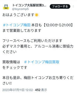 (マスク必須店)トイコンプ 大阪駅前第3ビル店 2023-07-11 最終更新日時 : 2023-07-11 taka_minami トイコンプ 大阪駅前第3ビル店トレーディング カード専門店大阪府大阪市北区梅田1丁目1−3 確認日 2023/07/11「必ずマスク着用と、アルコール消毒に御協力ください」(ツイッターからの情報になります) FacebookXBlueskyHatenaCopy